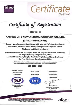 Kaiping Xinjinrong Barrel Making Co., Ltd. is a private enterprise specializing in barrel making, with more than 150 employees. The factory is located beside 325 National Road in Kaiping City, Guangdong Province, with convenient transportation, covering an area of 38 mu and a large scale. The company is a professional barrel making company with more than 20 years. It has introduced several production lines such as automatic forming of steel barrels and automatic spraying. Its products include various national and enterprise standard specifications such as iron drums, internal coating drums, galvanized drums, stainless steel drums and lined drums.